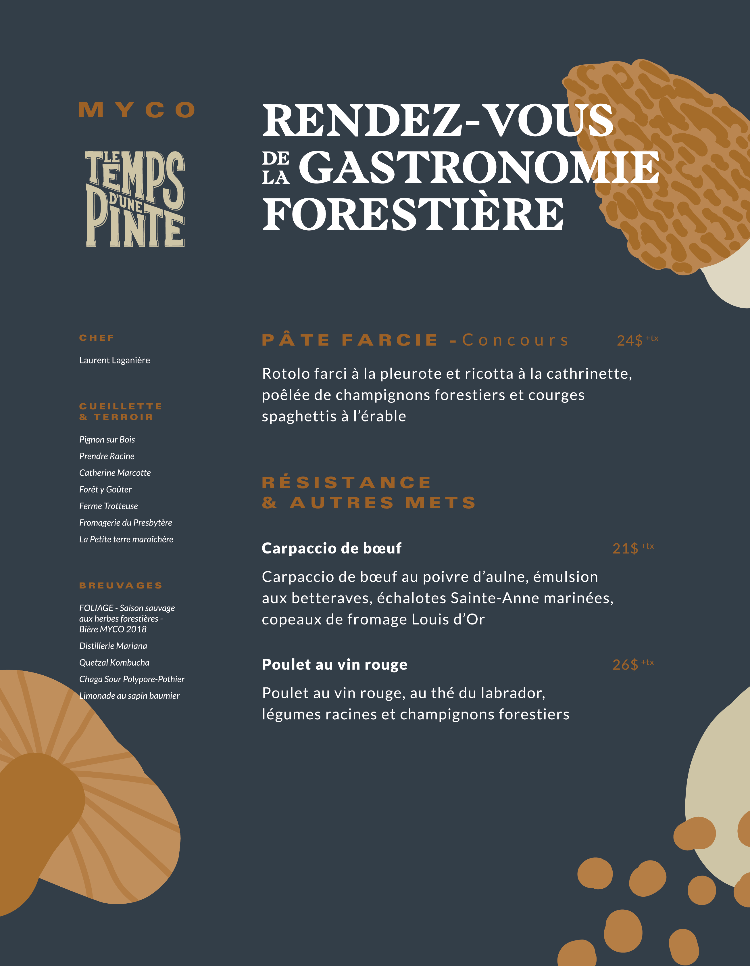 MYCO – Menu de notre Chef Laurent Laganière Par Le Temps d'une Pinte dans Nouvelles (30 septembre 2018) Voici le menu de notre Chef Laurent Laganière dans le cadre de MYCO 2018 ! Nous sommes fiers de cuisiner les produits du terroir mauricien et de cueillette forestière locale.